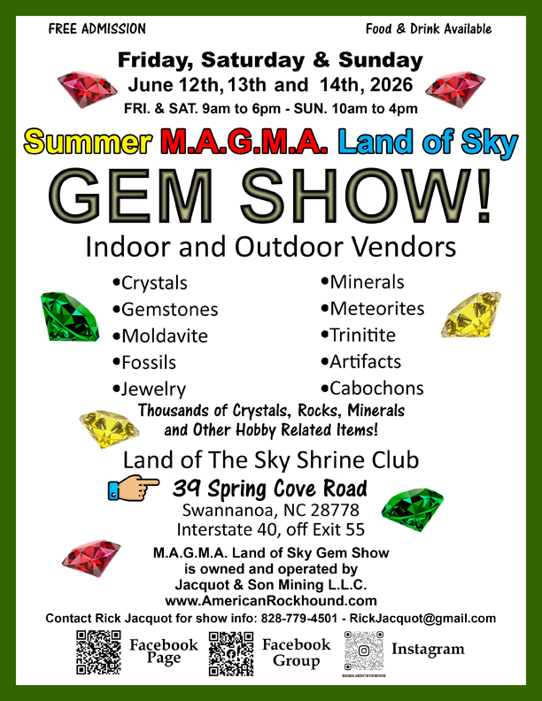 I have been in contact with Junior and Melissa about the spring Rock Swap and Dig. April 17th - 19th. The mountain will be open to collecting from 8 am to 5:45 pm each day, Friday, Saturday and Sunday. The gate will be locked at 6pm.