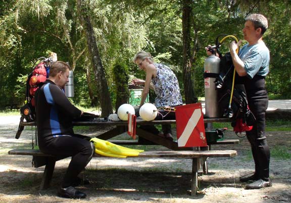Robert and I geared up. I planned to show Robert one of the many fossil beds in the Santa Fe River. Marcy was going to dig at the river bank for fossils and Sandy was filming everything. We made a great video of the trip that will be finished later. I got about an hour of great underwater video for the film. |