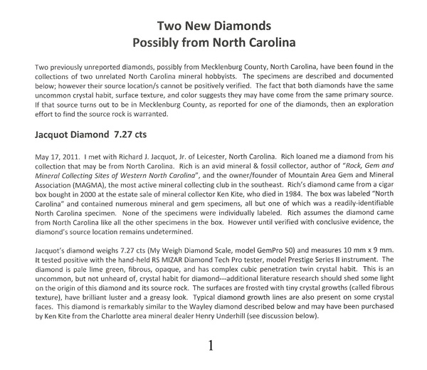 Featured on the cover of Volume I, Issue 2 of American Rockhound magazine, this is a possible North Carolina diamond (7.27 cts.) from the Ken Kyte collection. When I purchased the estate collection of Mr. Kyte in 2000, this was in a cigar box marked "North Carolina Gemstones" I was able to identify all the locations of the rubies, sapphires, aquamarine, emerald, etc, but not this one. I gave the diamond to geologist Ed Speer to write a paper and do some research. I still have no proof positive of the location found, but if this can ever be verified, it would make this the largest diamond ever found in North Carolina.