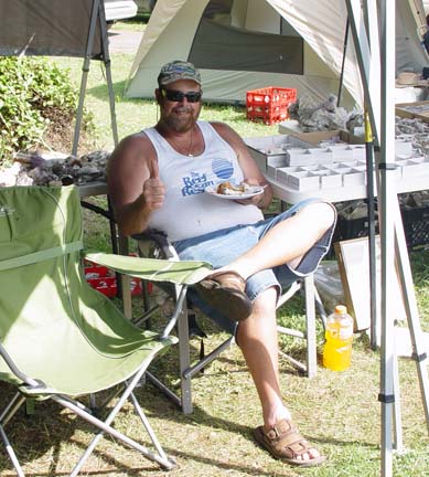 As the afternoon progressed, many more rockhounds rolled in to join us for dinner and friendship. Leonard raffled off his painting and the winner was Sue McGinnis. Unfortunately Sue was not present. Members were demonstrating wire wrap, knapping, cabbing, everyone was having a great time! We put out the kids sandbox full of gems and the kids had a blast. We had a lot more children at the event this year.